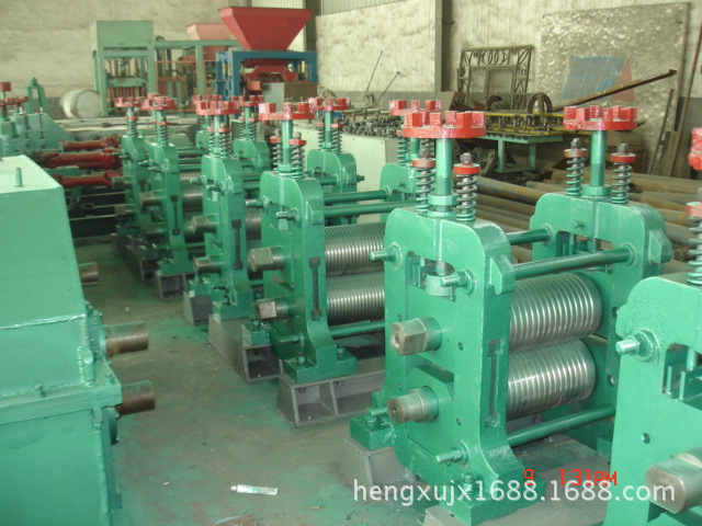 連續小型軋機所用坯料一般是連鑄小方坯,邊長一般是130-160mm,長度一般6-12m左右,坯料單重1.5-3噸。軋制線多為平立交替布置,實現全線無扭轉軋制,根據不同坯料規格和成品尺寸有18、20、22、24架的小型軋機,18架為主流。目前棒材軋制多采用步進式加熱爐、高壓水除鱗、低溫軋制、無頭軋制等新工藝,粗軋、中軋則向大坯料及提高軋制精度方向發展,精軋機主要是提高精度和速度,較高速度可達18m/s,產品規格一般為Ø10-40mm,也有Ø6-32mm或Ø12-50mm的。生產的鋼種為市場大量需求的低中高碳鋼、低合金鋼。其生產工藝流程是:步進式加熱爐→粗軋機→中軋機→精軋機→水冷裝置→冷床→冷剪→自動計數裝置→打捆機→切料臺架。