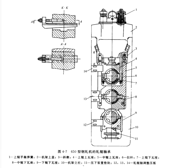650型鋼軋機的軋輥軸承如圖4-7所示,五塊整體壓制徑向和軸向膠木瓦分為別裝在相應的五個瓦座中,除中輥上瓦座5的材料為ZG40Cr外,其余瓦座為ZG35,上輥上瓦座4通過墊塊與壓下螺絲端部接觸,下壓座7通過拉桿6(每邊一根)掛在平衡彈簧上。為便于換輥,中輥上瓦座5是“H”形瓦座(簡稱H架),他向下的兩條腿通過嵌于機架上蓋燕尾槽中的斜楔3支撐在機架上,當中輥襯瓦磨損時,可通過斜楔3進行調整,使“H”形瓦架始終壓在中輥輥頸上中輥的下瓦座8直接支靠在機架立柱的凸肩上,下輥只有下瓦座9,它通過墊塊11直接支在壓下螺絲上。