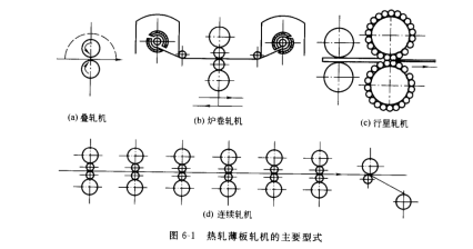 熱軋薄板有單張生產和成卷生產兩種生產方式,圖6-1所示為熱軋薄板軋機的主要型式。單張熱軋薄板主要是在單輥驅動的二輾不可逆式軋機上用疊軋的方法進行生產,國內1200疊軋薄板機屬于這一類,其成品厚度為0.2~3.7mm。這類軋機工藝簡單,設備少,故投資少,建廠快。但其勞動強度大,生產率低,金屬消耗大,板材表面質量不高,目前處于淘汰地位。