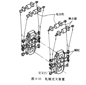 上、下交叉輥的傳動裝置用電機(jī)驅(qū)動,調(diào)整工作輥和支承輥軸承座的交叉頭是由電動機(jī)通過蝸輪減速機(jī)同時驅(qū)動的。當(dāng)軋輥軸承座間隙過大時,交叉頭之間的擴(kuò)大和縮小的微調(diào)是通過四臺電動機(jī)和八個離合器來完成的。